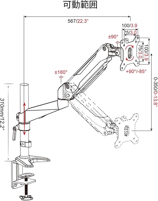 革新的な多軸設計で自由自在に角度調整! 回転360° 左右180° 上90° 下85°に調節可能で視覚の快適性を向上させ、目の疲れを軽減でき、作業効率向上に繋がります。