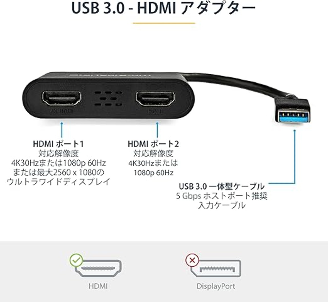 StarTech.com USB 3.0対応デュアルHDMIディスプレイアダプタ/1x 4K30Hz & 1x 1080p/USB Type-A接続/Windowsのみ対応 USB32HD2 | PCBASE