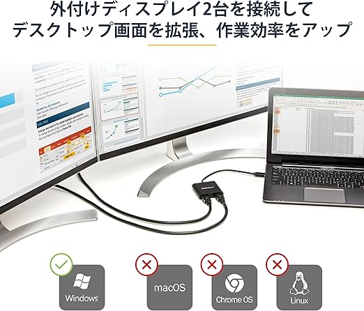 Windowsのみ対応:USB-A - デュアルHDMIマルチモニターアダプター(macOS、Linuxには非対応)。複数のディスプレイに接続が可能な外付けUSB 3.0(USB 3.1 Gen 1)グラフィックカードアダプターとして機能