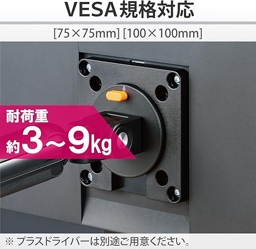 VESA規格(75mm×75mm、100mm×100mm)に準拠したモニターに対応しています。