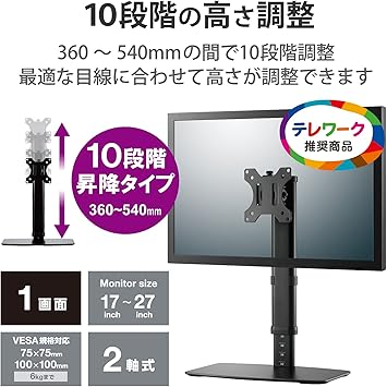 エレコム モニタースタンド モニター台 17~27インチ 対応 高さ調整 10段階 昇降タイプ 360° 調整可能 耐荷重 6kg ケーブルホルダー付 ブラック DPA-VL01BK | PCBASE