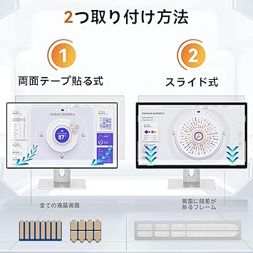 【2つの取付方法・着脱簡単】貼付けシールが2種類付属しています。「両面テープ」または「タブシール」を使用して簡単に取り付けられます。画面に段差があるフレームベゼルタイプにはスライド式で、段差のない液晶画面には、直貼り方式で貼付けるだけ簡単です。