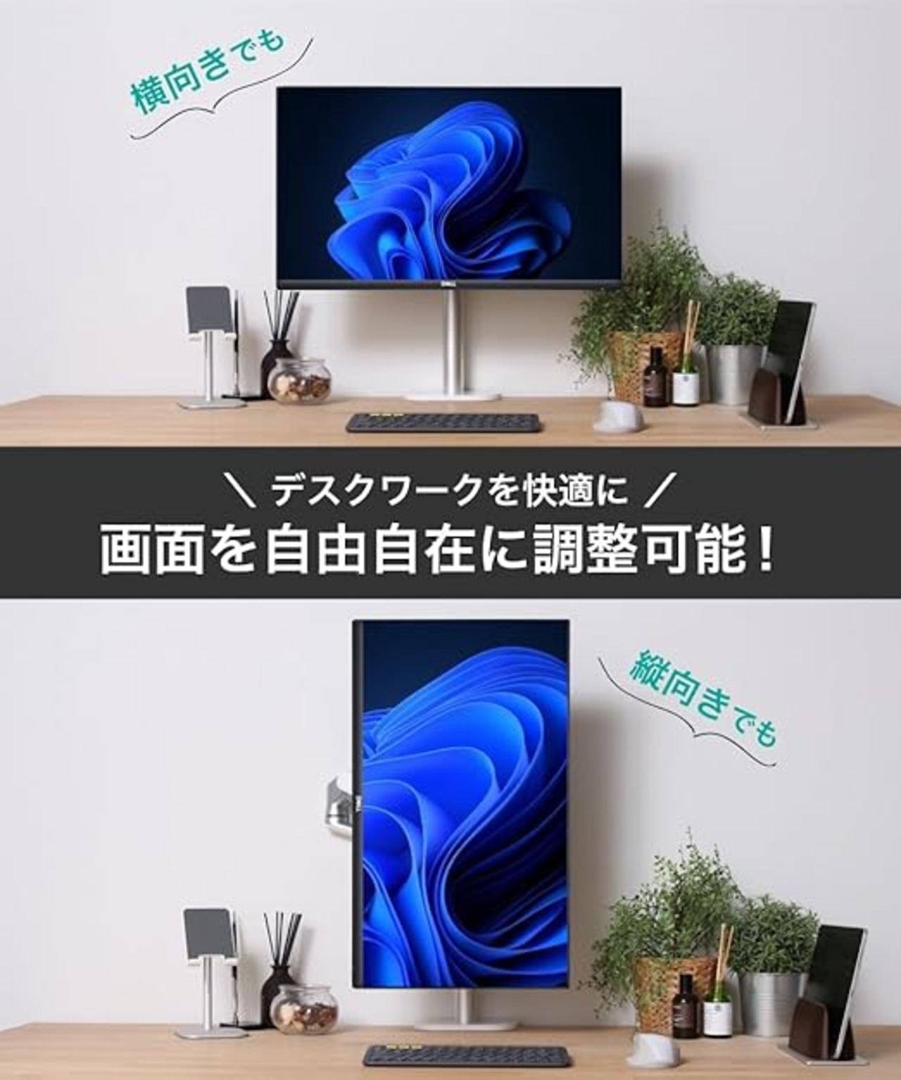 液晶ディスプレイを好きな位置に自在向けて設置することが可能。 液晶ディスプレイのスタンドがなくなり、今までデットスペースだったモニターの下の空間が活用できます。