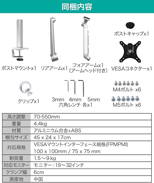 耐荷重 9kg、 32インチまでのディスプレイに対応。天板厚さが6cmまでの机に設置が可能です。設置方法も分かりやすく簡単です。クランプを回して支柱を固定するだけで予期せぬ地震やアクシデントからディスプレイの転倒を防ぎます。