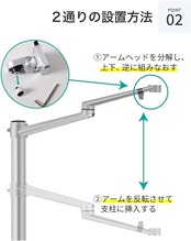 ダブルクランプ: 最大荷重は8kg、天板厚さが50mmまでの机に設置が可能です。クランプを回して支柱を固定するだけ、ダブルクランプだからデスクにしっかり固定ができ、予期せぬ地震やアクシデントからディスプレイの転倒を防ぎます。