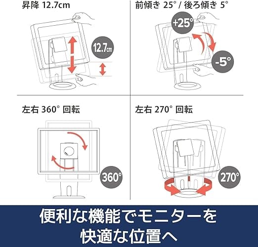 昇降幅は約13㎝、工具要らずで無段階に調節できます(24インチ以上のモニターを使用の際は、昇降幅に制限が出ます)。