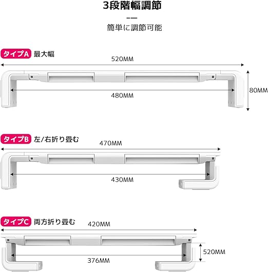 三段階の幅調整可能:モニター台をご自身の好みとデスクの広さに合わせて、横幅を三段階(420mm、470mm、520mm)に調節できます。さまざまなモニターをサポートできます。