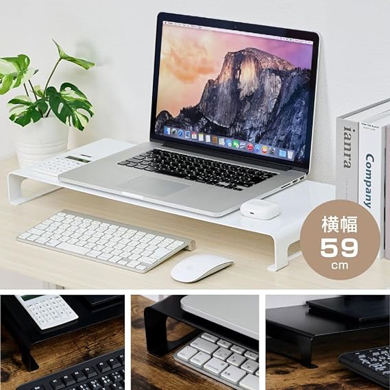 【製品仕様】商品サイズ:このモニター台は幅59cm、奥行25cm、高さ6cmの寸法を持っており、デスク上のスペースを最大限に活用できます。キーボードやマウス、その他の小物をモニター台の下にすっきりと収納できるため、作業スペースを広く保つことができます。