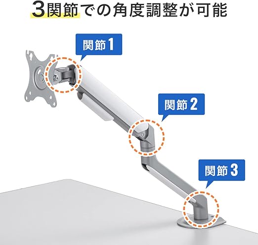 水平空間に対して大きく伸縮する3関節のスタイリッシュなモニターアームです。奥行きの広いデスクなどでの使用に最適です。