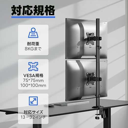 互換性:32インチ程度までの液晶ディスプレイを上下で2面設置でし省スペースに使えるモニターアームです。最大8kgまで(アーム1つにつき)、VESA規格(75×75mm、100×100mm)に準拠した液晶ディスプレイの取り付けが可能です。