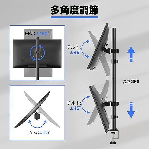 角度調節:画面回転360度、画面左右180度、画面上下45度調整可能です。支柱上で任意の高さに固定することができ、使用する人の使いやすい高さに調節できます。