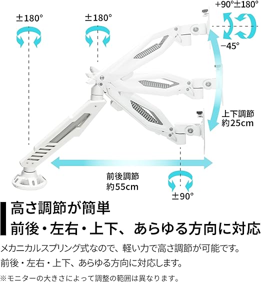 高さ調節が簡単。前後・左右・上下、あらゆる方向に対応