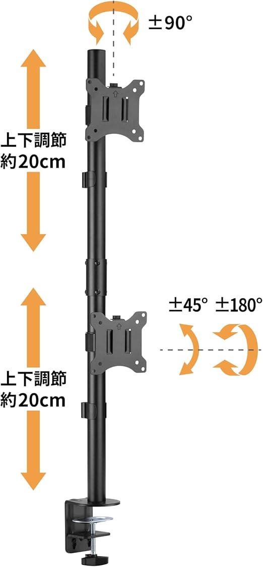 【モニターの縦方向・角度の調節が可能】取り付けたモニターを360°回転できるので、縦方向での使用も可能です。また、左右パン方向に180°、上下チルト方向に90°までの角度をつけられるので、お好みの位置にモニターを調節できます。 ※モニターの大きさや重量によって調節の範囲は異なります。