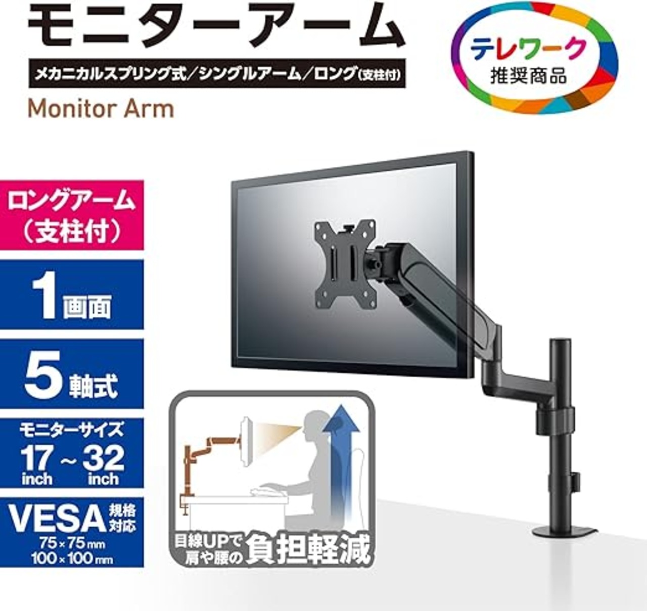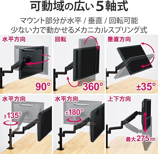 モニターを1台設置できるシングルアームタイプです。 ■可動域の広い5軸可動のロングアームタイプです。