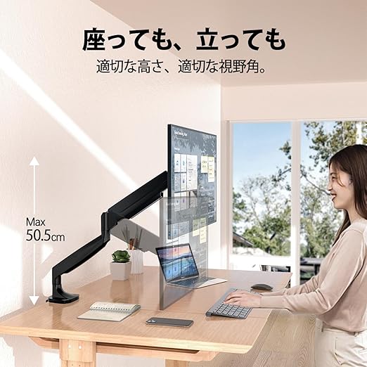 【高さ調整?猫背対策】高さは最大50.5cmまで調節可能で、座って作業するときも立って作業するときも、自由に切り替えられます。モニターアームでモニターを浮かせ、ケーブルガイドでケーブル配線を収納することで、デスクをより広々と使うことができます。