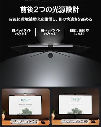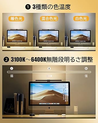 【3色温度無段階調光?反射光制御】このモニターライトは黄色光、自然光と白色光の3種類色温度が切り替え、3100?6400Kの色温度の範囲をカバーして、様々なシーンで活用できます。明るさは無段階調整でき、ニーズによって選ばれます。非対称光学設計により、スクリーンからの反射光を制御し、長時間PC作業で目にかかる負担を減らします。その上、 ライトの演色性は90Ra以上となっており、照らされる物の本来の色は変わらなく、リアルな色を示します。光源波動は安定です。