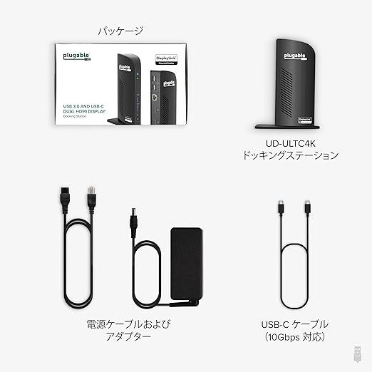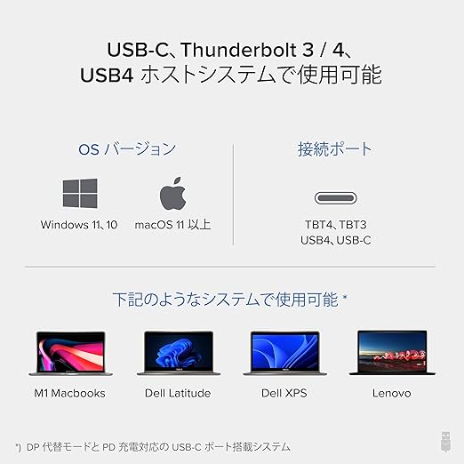 互換性 - Windows 10 以上、macOS 11 以上、ChromeOS 100 以上の、USB-C ポートが搭載されたシステムで使用できます。接続する USB-C ポートは、Thunderbolt 4、Thunderbolt 3、USB4、または DisplayPort 代替モード、およびホスト充電に対応している必要があります。DisplayLink デバイスドライバの導入が必要です。また、画面ローテーション、クラムシェルモードなどの一部の機能に制限があります。HDCP には非対応です。