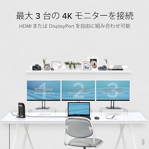 3 台の 4K モニタ - DisplayPort ポートが 3 つ、HDMI ポートが 3 つ搭載されており、これを自由に組み合わせて最大 3 台までの 4K@60Hz 対応外部モニタを接続することができます。モニタ側の入力ポートがどちらであっても、変換アダプターの使用せずに接続可能です。ただし、接続されるシステム側の USB-C ポートが USB4 / Thunderbolt 4、Thunderbolt 3 または DisplayPort 代替モードに対応していなければなりません。USB-C ポートのないノート PC では使用できません。