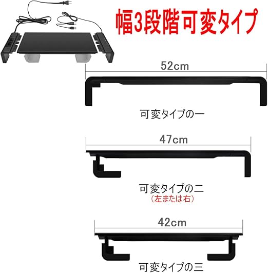 Point 3:脚の差し込む位置によって幅を3段階(42/47/52CM)の幅で調整可能できます。耐久性と美観性を備え、パソコンのディスプレイだけに適用することではなく、ノートパソコン、プリンター、テレビ、タブレットなどにも利用できます!