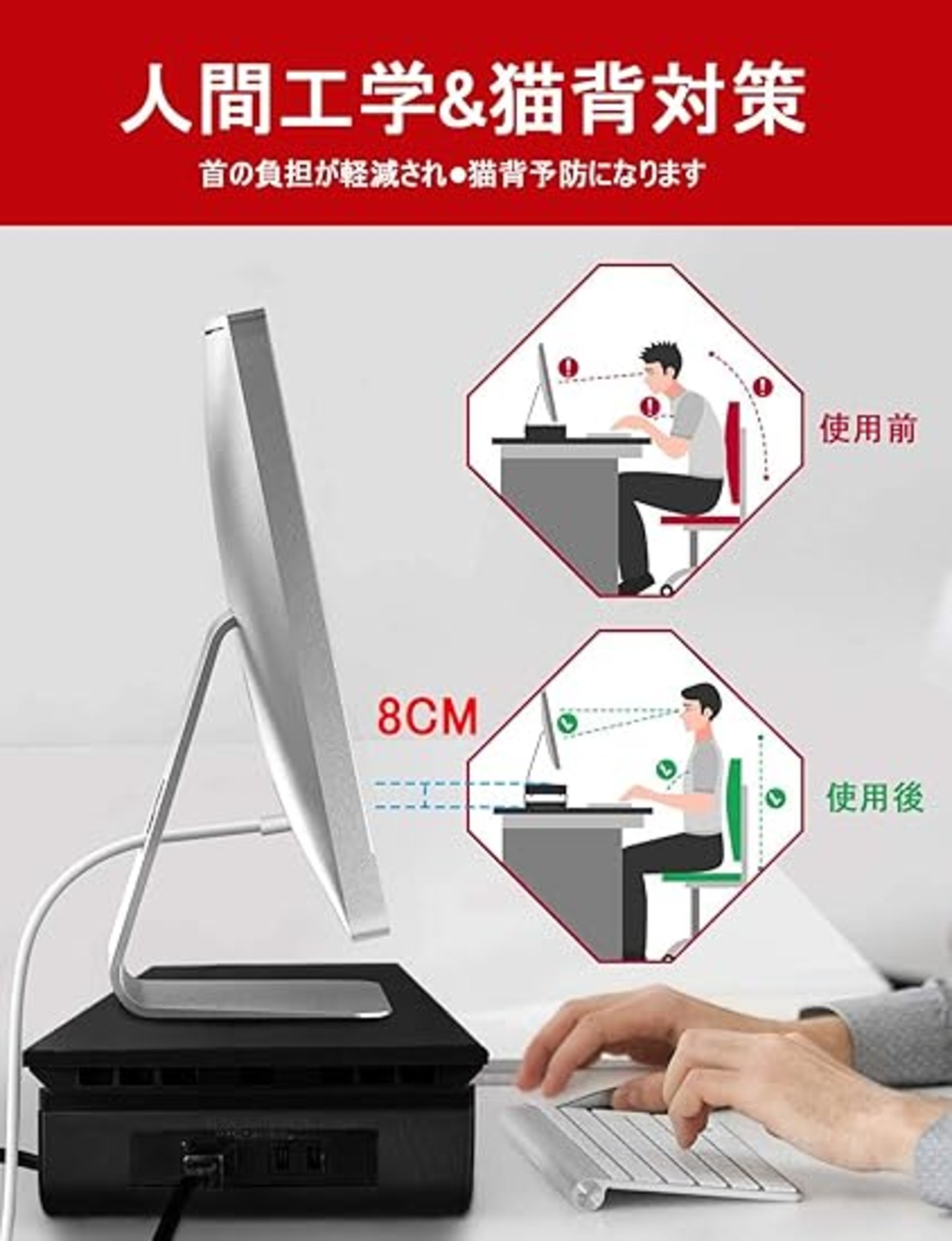 Point 1:モニター台 で液晶ディスプレイの高さを8cm上げることで、目線が自然に上がり、背筋も伸びるようになり、猫背や肩こりを予防することができます。姿勢を正しく保つことができれば、楽な作業、健康な生活ができます!