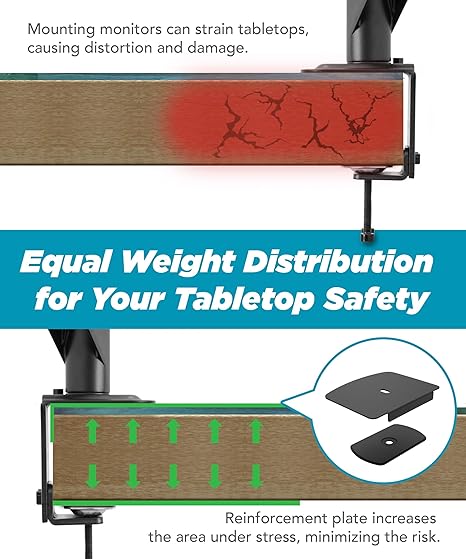 モニターマウントの互換性を拡張 - 高品質のスチールで作られ、滑り止めおよび傷防止パッドが装備された補強プレートにより、モニターマウントが薄いガラス、パーティクルボード、MDFテーブルに確実にフィットします。