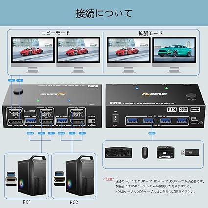 KCEVE デュアルモニター USB3.0 DP HDMI KVMスイッチ 8K@60Hz/4K@120Hz 2入力2出力(コピー/拡張モードをサポート) 2台のモニターと1組のキーボード、マウスを共有できる | PCBASE