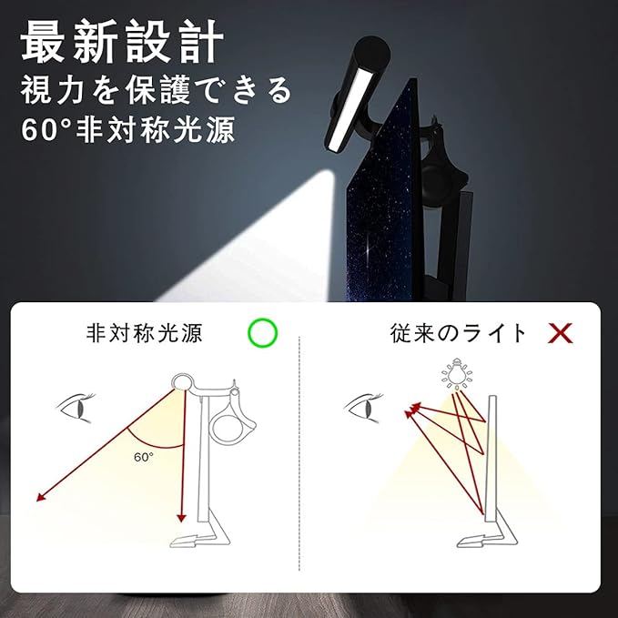 ??【目に優しい&高い適応性】非対称光学設計により、スクリーンからの反射による反射光がゼロになって、見えづらくなりません。照明の角度が調整でき、光が目に入らないような設計になっています。スクリーンライトは最新の技術を採用して、眩しすぎなく、輻射の危害がなく、目を保護し、異なるシーンの光に対するニーズを満足できます。伝統的なデスクライトに比べるともっと高効率的仕事に完成します。適合するモニターの厚さは0.4インチ( 1cm )から1.2インチ( 3 cm )を参照してください。