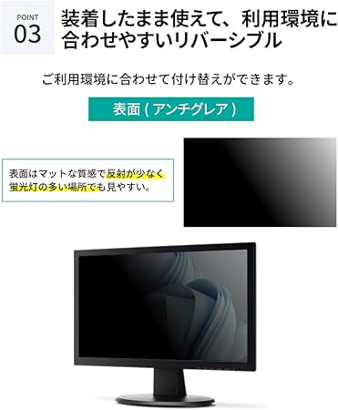 [ リバーシブル ] 表面はマットな質感で反射が少なく蛍光灯の多い場所でも見やすいアンチグレア面(反射防止加工・非光沢)、 裏面は反射率が高くサイドからの覗き見防止効果が大きいグレア面(光沢)です。ご利用環境に合わせて覗き見防止フィルターをご利用いただくことができます。