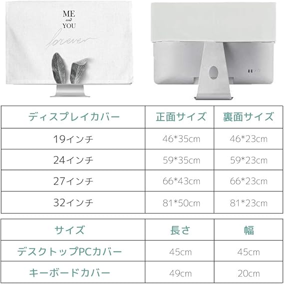 【サイズ】ディスプレイカバー:19インチ(46x35cm)、24インチ(59x35cm)、27インチ(66x43cm)、32インチ(81x50cm) デスクトップPCカバー:45x45cm キーボードカバー:49x20cm