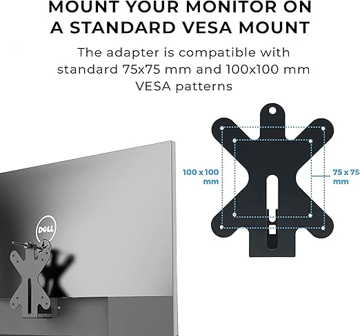 この VESA マウント アダプターを使用して、Dell モニターを VESA アーム、VESA スタンド、VESA デスク マウント、および VESA ウォール マウントに VESA マウントします。 VESA アダプター マウント ブラケットは、ほとんどのワークステーション VESA マウントに見られる 75x75 mm および 100x100 mm の標準モニター マウント サイズに適合します。