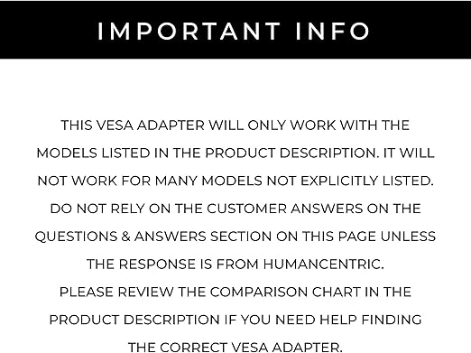 満足保証: 当社の VESA アダプターは、ここに記載されている互換性のあるモニターに適合することが保証されています。私たちは品質に非常に重点を置いていますが、パッケージの紛失、製品の損傷、または製造変更の監視など、「何か」が発生します。このマウントに問題がある場合は、私たちが最善を尽くして正しくすることを信頼してください。お客様の満足が保証されるか、返金されます。