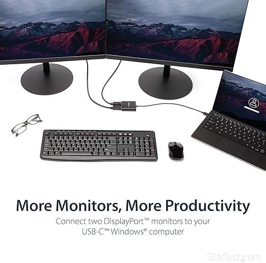 長尺ケーブル:30cm一体型ケーブル付きUSB-C - デュアルモニター DisplayPort変換アダプター。Surface Pro 7、HP Elite x2などの2-in-1やライザーに載せたノートパソコンのポートにかかる負担を軽減。オフィス、ホームオフィス、共有ワークスペース、外出先などでの使用に最適