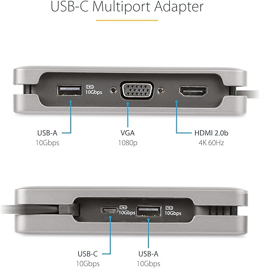 USB-C対応ミニドッキングステーション:UHD対応のモニターやディスプレイへの接続用HDMI 2.0b(4K60Hz)およびVGA(1080p)ポート、100W Power Deliveryパススルー(USB PD 3.0)、3ポートUSB 3.2(10Gbps)ハブ(2x USB-A、1x USB-C)、ギガビットイーサネットポート(PXEブート/WoL)を搭載