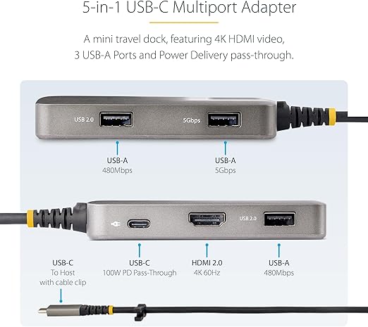 5-in-1マルチポートアダプター:モニター/ディスプレイ接続用DP 1.4 Alt モード経由でUHD 4K60Hz HDMI 2.0b (HDR10)ビデオ出力に対応するポータブル多機能USBCマルチハブ。3ポートUSB-Aハブ(2x USB 2.0 480Mbps & 1x USB 3.2 Gen 1 5Gbps)。100W USB-C Power Deliveryパススルー