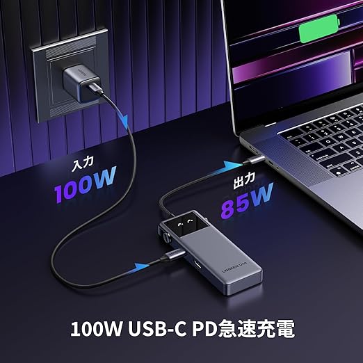 【PD100W急速充電】USB-C PD ポート経由で最大 85W の USB C パススルーをサポートし、他のインターフェース操作用に 15W を確保します。 USB-C ポートはPD充電のみをサポートし、データ送信はサポートしません。 接続をより安定させるために、100Wの充電器とケーブルに接続してください。