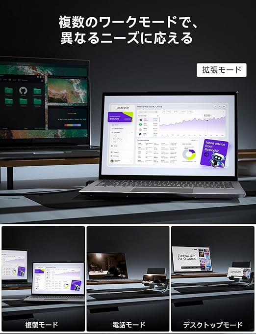 ??【多機能モード 】14インチ モバイルモニター Dopesplayノートブック拡張ディスプレイには、5000mAhの内蔵バッテリーがあり、ディスプレイの電源だけでなく、Type-Cインターフェースを通じてスマートフォンへの充電も可能です。最長6時間のバッテリー寿命により、有線接続時でもデバイスの充電を維持できます。モバイルデータでの常時オンライン、ヘッドホンジャック、Micro SDカードスロット、USBポートが備わっており、追加ドライバーやアプリケーション不要で、遅延なく快適な体験が楽しめます。[デュアルスピーカーと内蔵キーボード] Dopesplayは、高品質のデュアルスピーカー搭載により、映画鑑賞、ゲーム、ビデオ会議などあらゆるシーンで没入感のある音声を提供し、体験の楽しみを大幅に増幅します。さらに、第2の画面には内蔵キーボードも搭載されており、外部キーボードなしでスムーズなタイピングとナビゲーションが可能です。ディスプレイ上でノートブックのような快適さを味わえます。