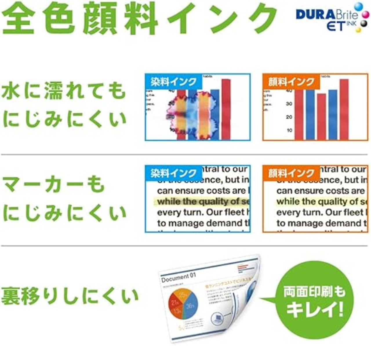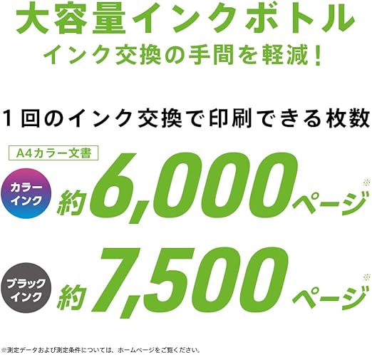 大容量インクで消耗品の購入・ 手間軽減を実現 A4カラー文書をカラーインクで約6,000ページ、ブラックインクで約7,500ページの大量プリントが可能。