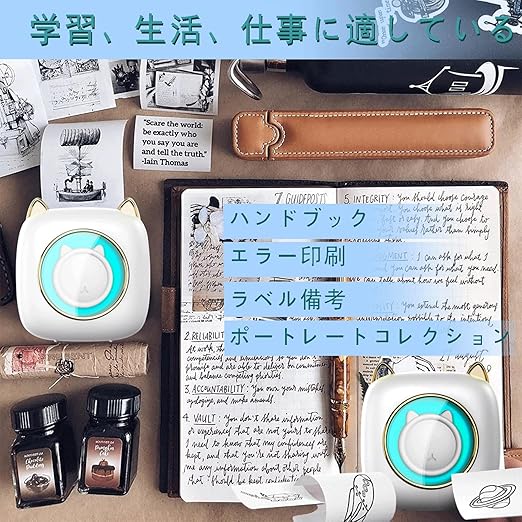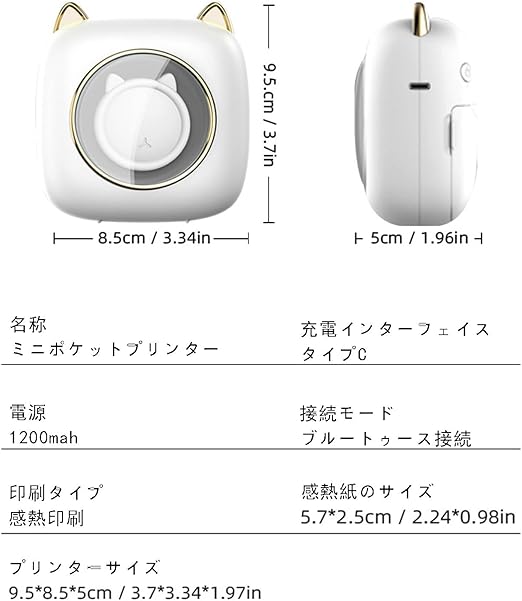 ポータブルミニプリンター: 9*5*11 cmのミニボディは、どこにでも持ち運びができ、Bluetoothに接続するだけですぐに印刷でき、勉強や仕事、生活がより便利になります。当社のミニプリンターは、かわいい猫の外見でデザインされています。 プリンターのスイッチを入れると、猫の外側のリングのLEDが7色に変化し、あなたの生活に楽しさを加えます