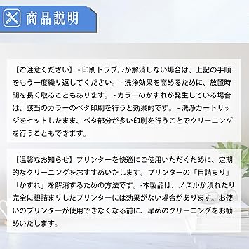 ★【商品説明】 ・プリンタの操作パネルから、「セットアップ」−「メンテナンス」−「クリーニング」を選択し、ヘッドクリーニングを2回繰り返してください。その後、2時間以上放置し、再度プリンターヘッドのクリーニングを2回行ってください。洗