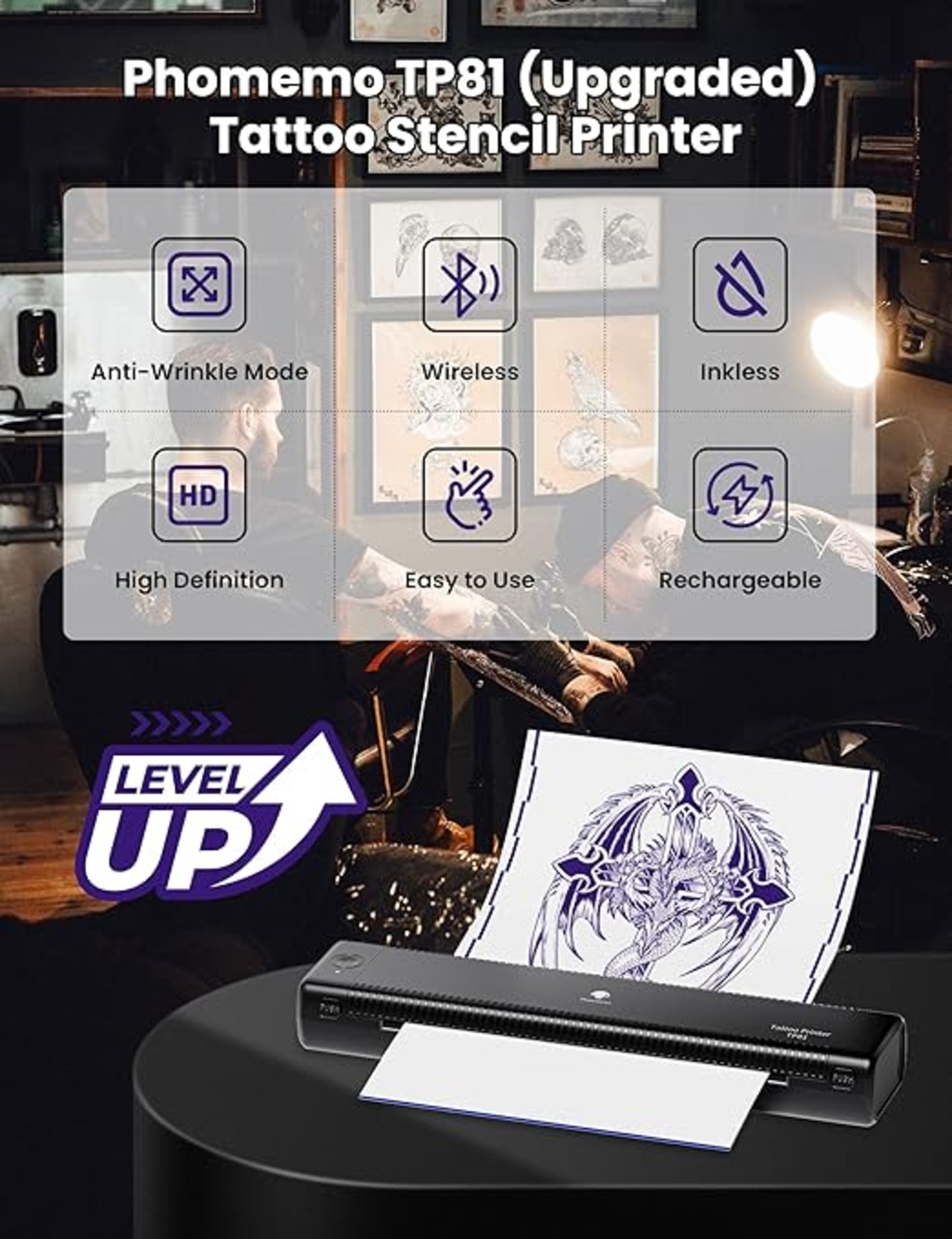 [新しいアップグレード] タトゥー・プリンター! : Phomemo TP81 タトゥーアーティストや初心者のためにデザインされた、充電式バッテリー内蔵のワイヤレス/軽量/ポータブルBluetoothタトゥーステンシルプリンター。 重量はわずか1.6ポンドで、従来のマシンより50%軽量です。