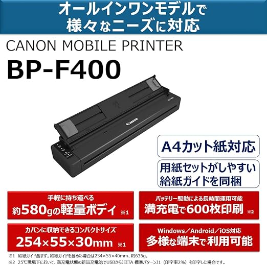 キヤノン モバイルプリンター BP-F400。A4カット紙対応。場所を選ばない印刷でモバイルワークの生産性向上を支援。