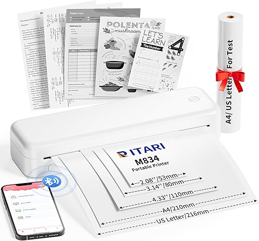 Itari M834 モバイルプリンター a4 コンパクトで持ち運びに便利なポータブルプリンターです。幅広い用途に対応し、216mm/210mm/110mm/80mm/53mmのワイドなサイズに印刷できます。Bluetooth接続により、ビジネス、旅行、学校、自宅、タトゥースタジオなど、さまざまな場面で活用できます。サーマルプリンターであり、感熱紙に対応しています。 | PCBASE