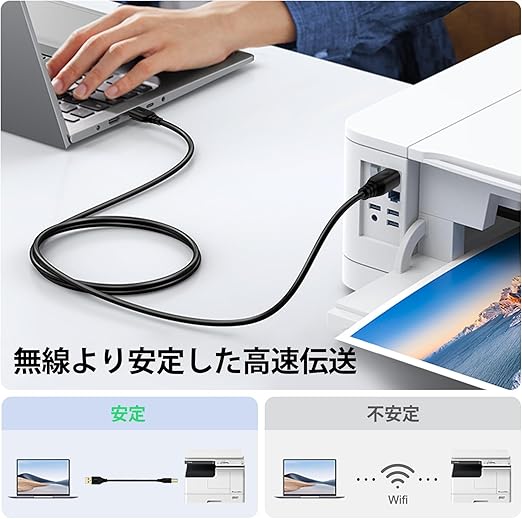 【USB 2.0 プリンタケーブル】USB2.0 (タイプb)規格対応のプリンター、Fax 、スキャナなどの転送速度が重要となる設備、マウスやキーボード等の周辺機器をUSB(タイプa)のインターフェイスを持つパソコンと接続する高性能usbケーブルです。また、このUSB Type B ケーブルはドライバーを必要がありません。WIFI接続より、もっと安定で使いやすいです。