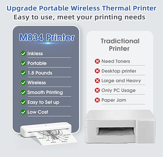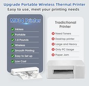 2024 【改良】ポータブルプリンター:Phomemo M834ポータブルプリンターは、輸入サーマルプリントヘッドを搭載し、DPIは47%アップの300DPIになりました。ワイヤレスで軽量、重量はわずか1.8ポンドで、従来の機械より50%軽くなっています。 内蔵の2600mAh充電式バッテリーにより、インク、トナー、リボンが不要になり、印刷コストを80%以上節約。 最大300dpiの印刷解像度で、写真や文書が鮮明で細部まで再現され、いつでもどこでも自由に印刷できます。