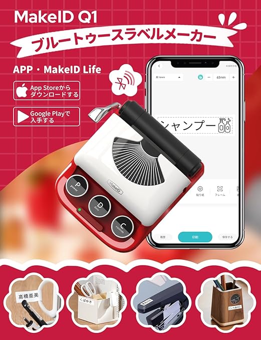 MakeID Q1ラベルプリンター 300dpi Bluetooth対応 スマホ接続 レトロで可愛いデザイン 無墨熱敏印刷 Cキー&Dキー簡単印刷 簡単操作 16mm幅対応 日本語説明書付き ギフトにも最適ヴィンテージレッド | PCBASE