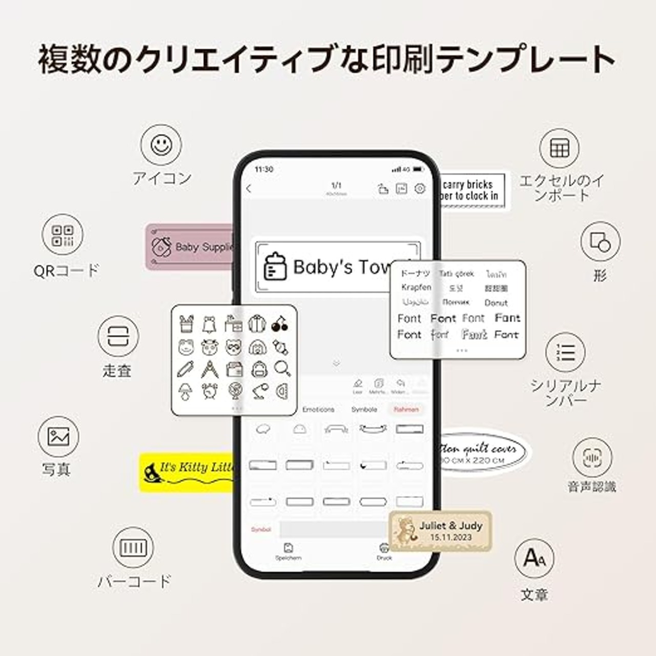 【高品質印刷】高速チップと203DPIを搭載し、インクやトナーに頼らず高画質の印刷を楽しめます。本体は耐久性に優れた充電式バッテリーを内蔵しており、長時間使用可能です。ラベル
