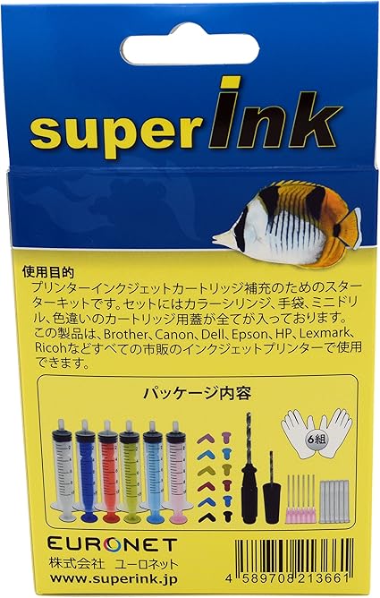 superInk リフィル セット(6色) インクカートリッジ補充用アクセサリーセット(キヤノン エプソン ブラザー HP リコー) 6色の10ml注入器 + 6組の手袋 + ミニドリル 2mm + ミニドリル 3.6mm + シリコーンプラグ 4mm (セット6色、2種類 合計12個) | PCBASE