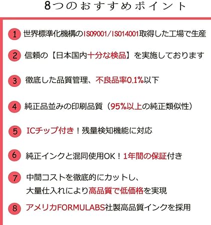 高品質の互換インク: 最新ICチップ搭載、全ての互換インクカートリッジには純正インクと同様に残量表示機能付き、純正インクと同様にお使いいただけます。純正品と比較しても遜色ない高品質、本物の写真と鮮明なテキストに見合う素晴らしい色で印刷します 増量タ
