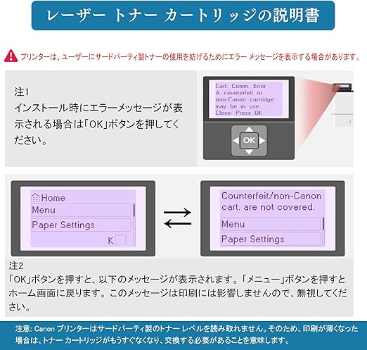 【重要なヒント】NO OEM: 互換トナーカートリッジをインストールする前に、CANON純正モードを閉じる必要があります。CANON純正モードを閉じるテップは下記です: メニュー>管理設定>デバイス管理> CANON純正モード>Off CANON純正モードを閉じて、互換トナーを取り付けてから、「非CANONカートリッジが挿入される可能性があります」とプロンプトはプリンターにでます、「OK」キーを押して、トナーカードリッジは動きるはずです。