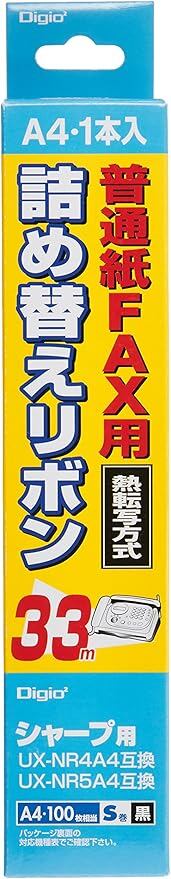 適応リボン : シャープ UX-NR4A4、UX-NR5A4 A4・33m・黒・S巻き・1本入 印字枚数:A4約100枚 本体寸法:220mm幅×33m巻